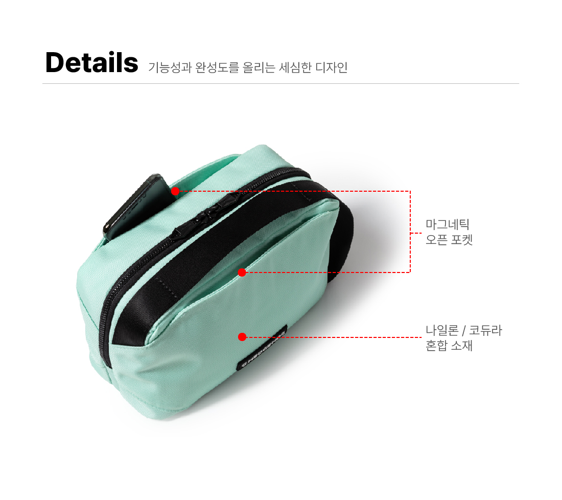 혁신적인 나일론/코듀라 혼합 소재로 제작한 파우치백입니다 / 미니멀한 디자인과 앞뒤로 마그네틱 오픈 포켓이 있어 간편하게 수납 할 수 있습니다.