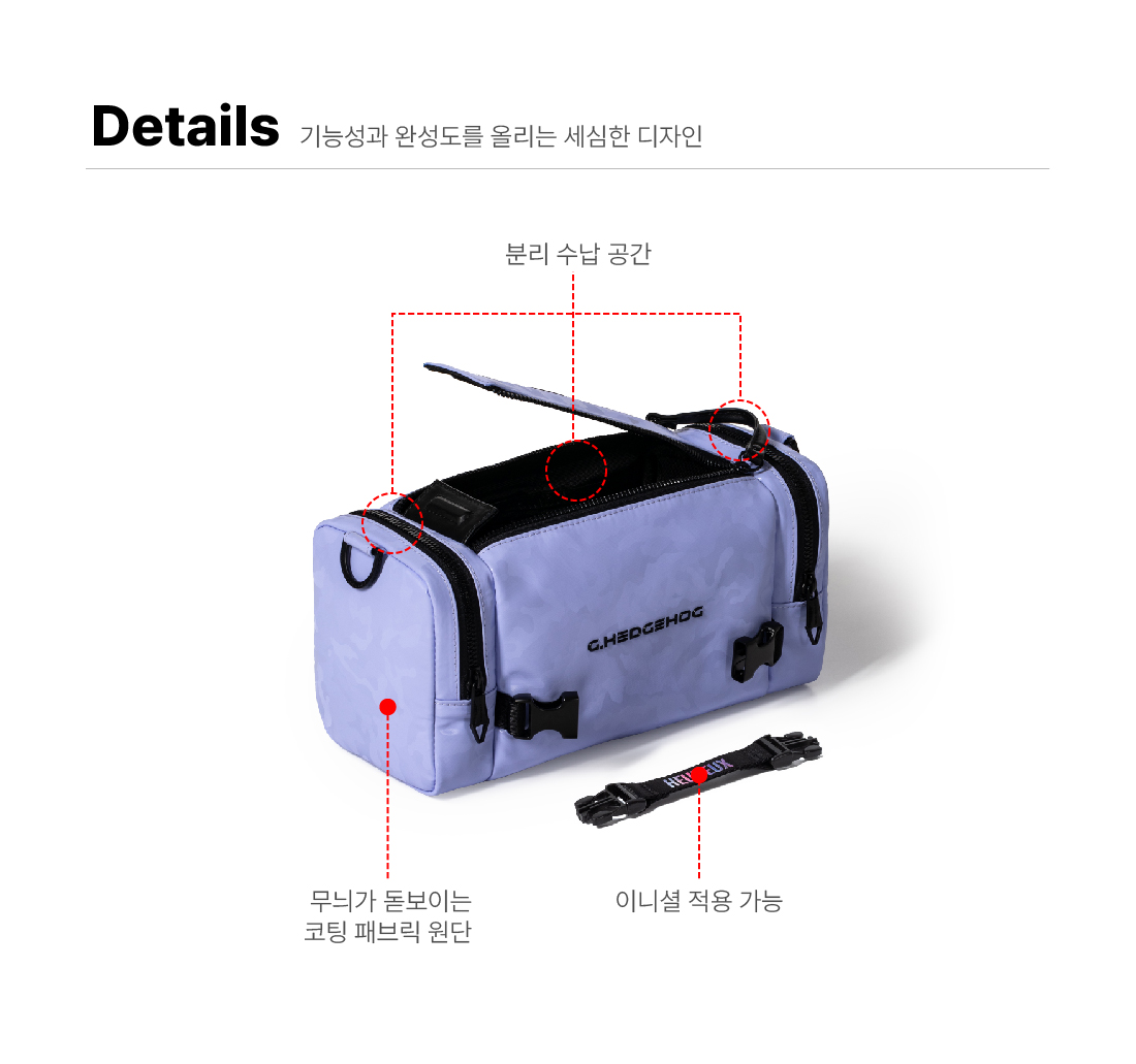 디자인 특허받은 유니섹스 스타일이며, 분리된 수납이 특징입니다 / 탈부착 가능한 숄더 스트랩이 내장되어 있어 이동시 편리하게 착용 할 수 있습니다 / 코팅된 패브릭 원단으로 컬러별 무늬가 다른 것이 특징입니다 / 정면 탈부착 스트랩에 이니셜 적용 가능합니다.(이니셜을 원하시는 분은 추가 요청 사항에 기재바랍니다.)