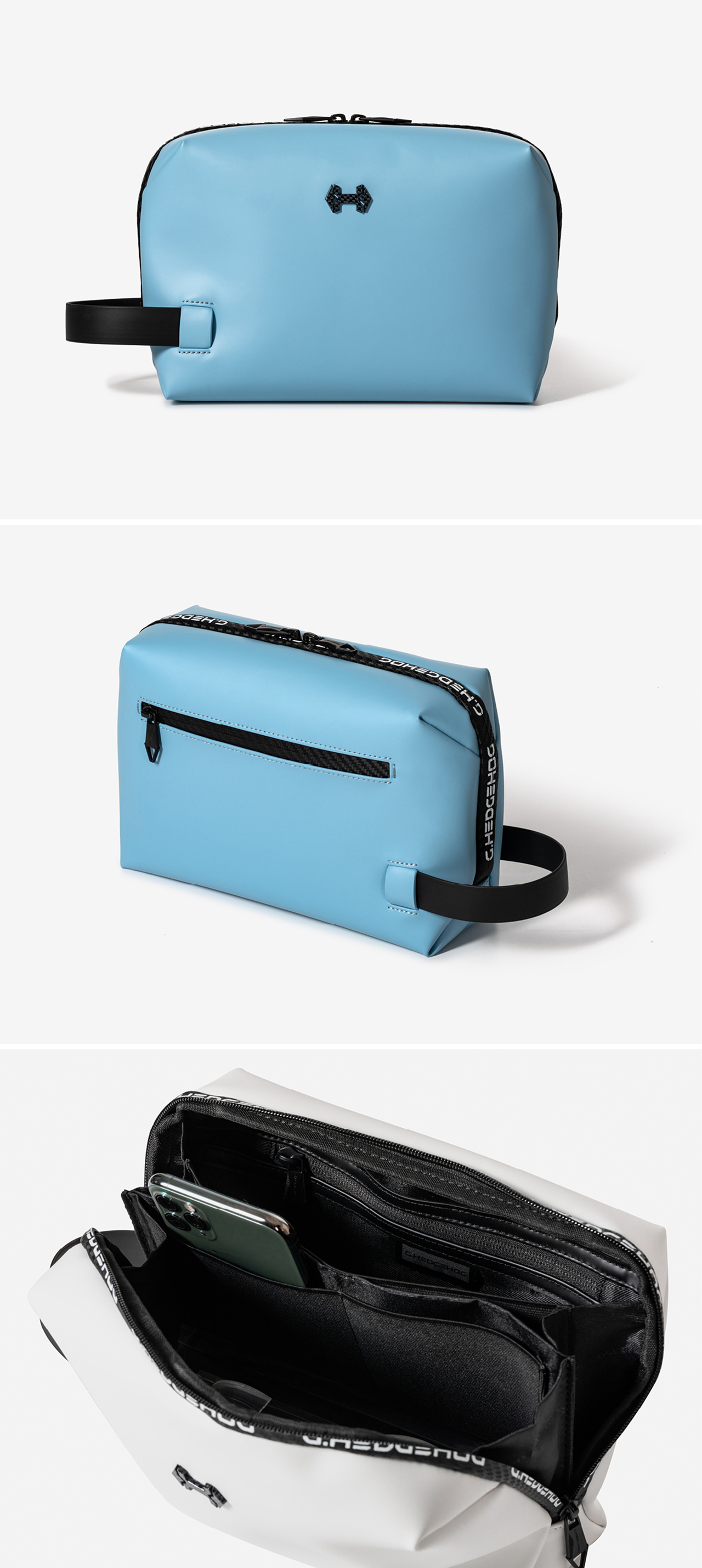 미래지향적이고, 테크니컬한 분위기가 돋보이는 파우치백입니다 / 겉은 심플하지만 내부 포켓 디테일이 있어 다양한 제품을 넣기 편리하게 분리되어있습니다 / 차별화된 기능성 방수 합성 피혁입니다.
