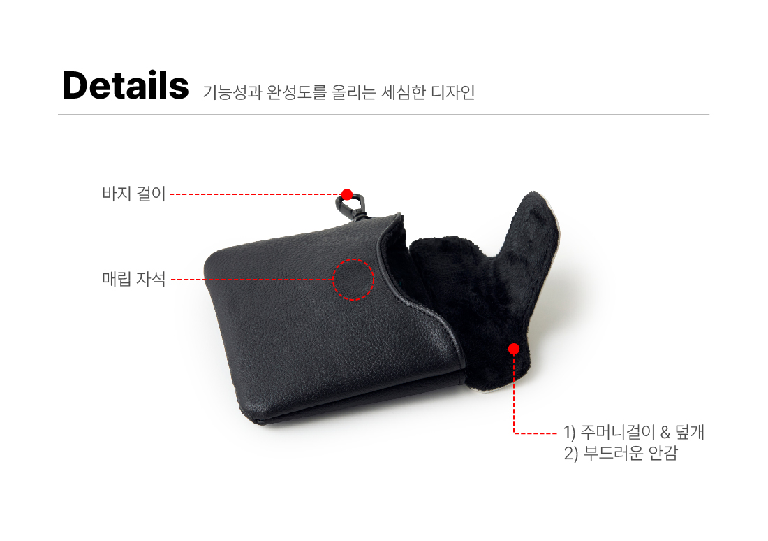 * 바지 걸이, 주머니에 간편하게 탈부착 가능한 기능적인 퍼터 커버.